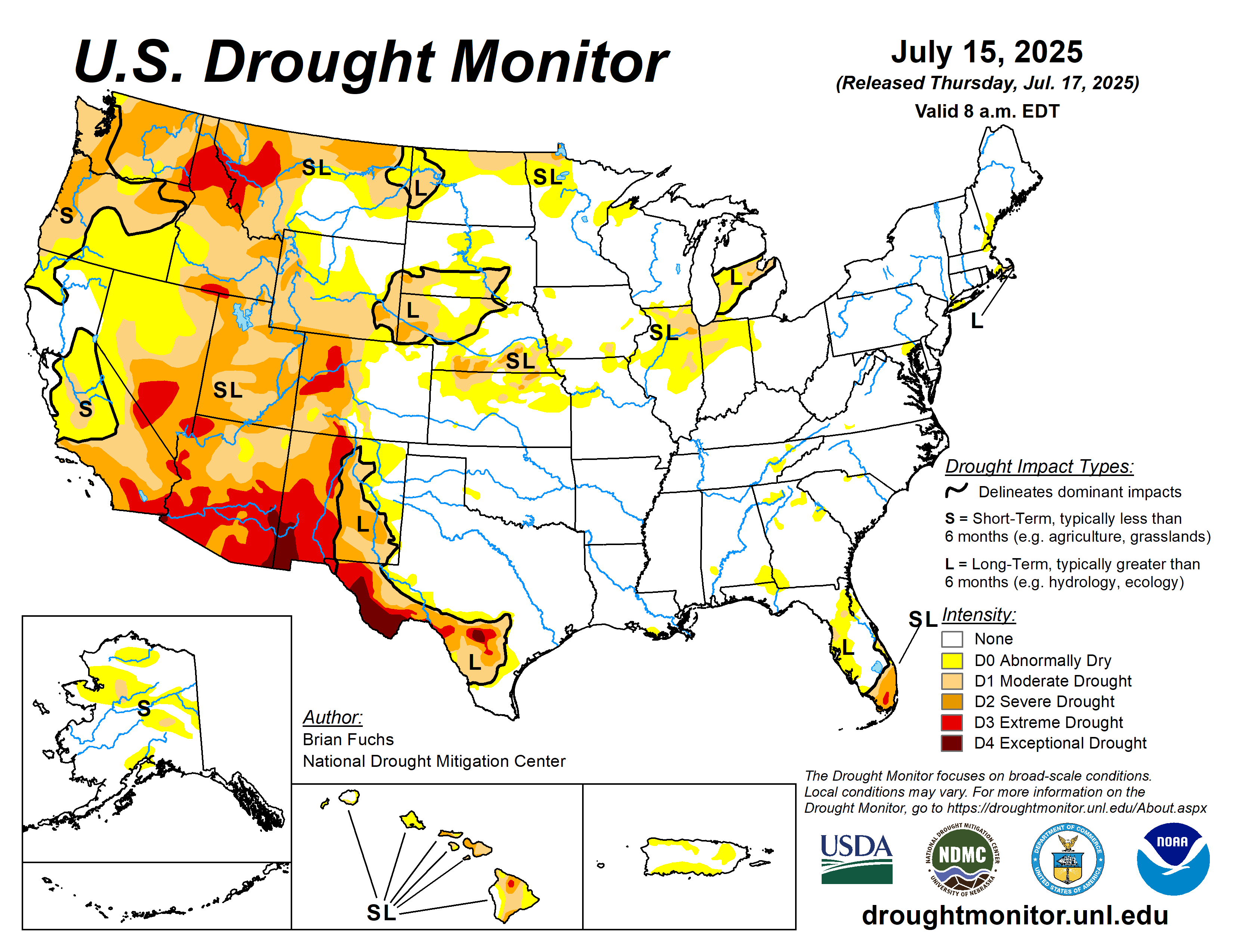 Starting with the weather; I’m not sure the last time that I’ve seen such a friendly drought monitor in mid-July. From a midwestern perspective, it’s not just affecting row crops, either. I was home in Southwest Missouri for the 4th, and there was a lot of baling going on. I don’t ever recall seeing that density of bales in the fields in July. If the past decade’s cattle herd numbers have been held back by some combination of balance sheet, profitability, or pasture and forage availability, that won’t be the case in 2025. I expect that the beef herd is already growing, and this will hopefully provide some additional grain demand in the coming years. In the July WASDE, feed use (across all species) is forecast to rise about 120m bushels when combining corn, wheat, sorghum, barley and oats. I believe that this is too low; and expect to see another 25-40m bushels of feed demand added as we go through the marketing year.